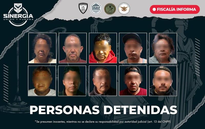 La Fiscalía General del Estado (FGE) de Querétaro coordinó un operativo en el marco de la estrategia Sinergia por Querétaro, logrando la detención de 10 personas en diferentes colonias de la zona metropolitana, como Colinas de la Piedad, Villas de la Piedad, Zapata Vive, Jesús María y Carrillo.